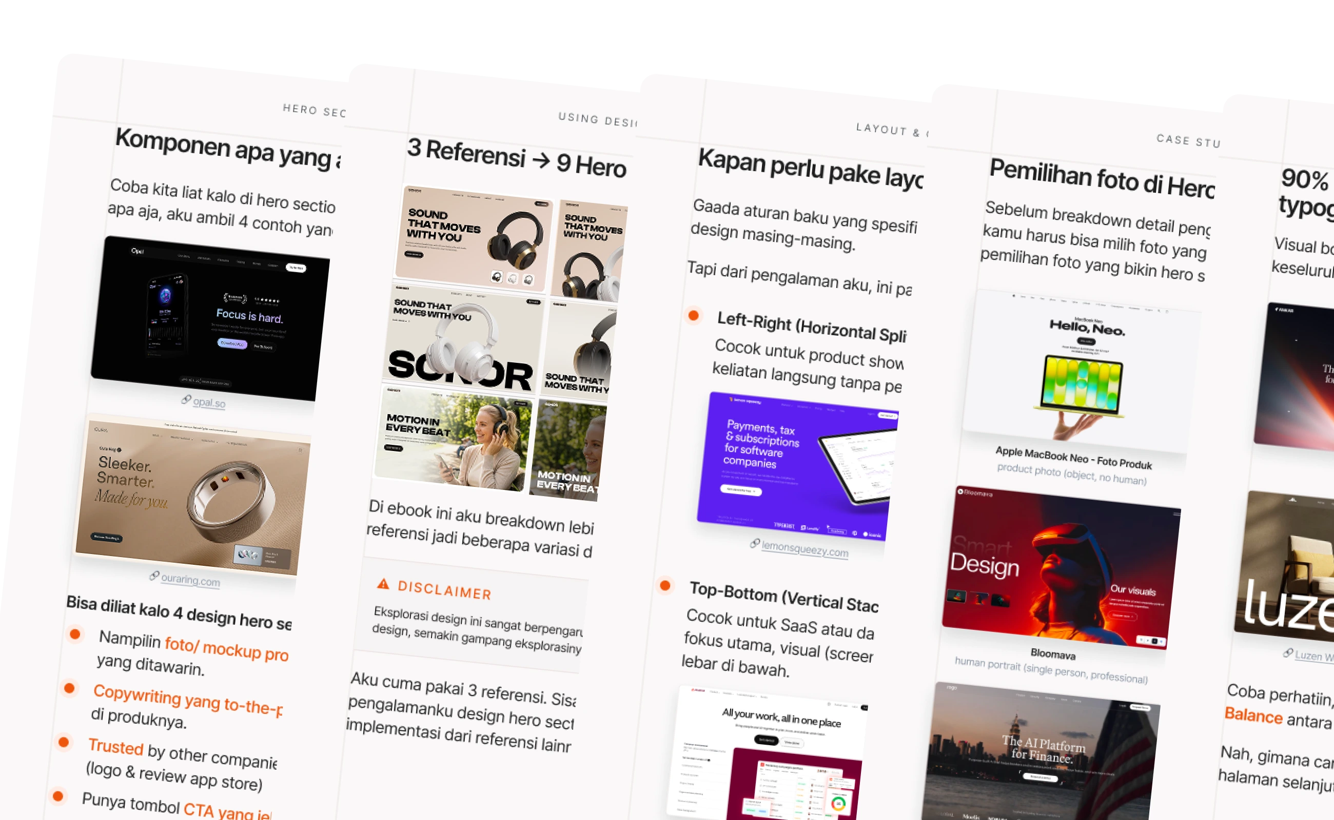 E-book ini berawal dari keresahan aku sendiri, dulu pas awal berkarir sebagai UI/UX Designer, design hero section aku selalu kelihatan "biasa aja". Dan ini juga sering banget aku temuin di Junior & Mid-Level designer, terutama yang background-nya bukan designer.